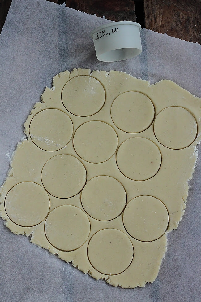 Étalez la pâte entre deux papier sulfurisés puis détaillez des cercles de 6 cm de diamètre.
