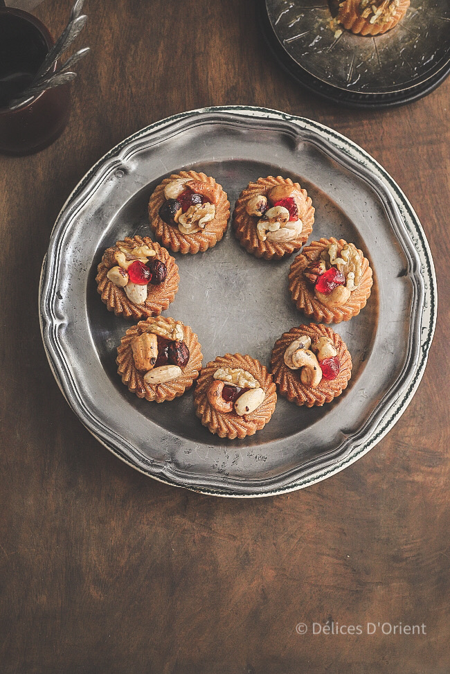 Égouttez et décorez de fruits à coque (chauffez légèrement le miel et le glucose, versez les fruits, mélangez et utilisez aussitôt).
